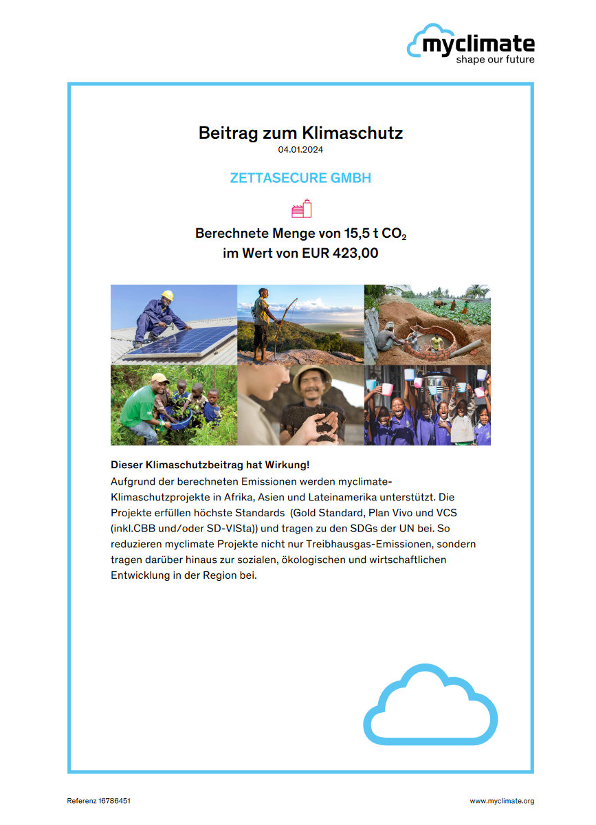 Es freut uns sehr, dass Sie sich ebenso für die Umwelt interessieren wie wir! Wir bei Zettasecure sind uns der zunehmenden Bedeutung von Nachhaltigkeit und Umweltarbeit bewusst. Deshalb engagieren wir uns für einen verantwortungsvollen, nachhaltigen Umgang mit der Umwelt. Um dies zu gewährleisten, unterstützen wir CO2-Kompensationsprojekte und reduzieren generell unseren Fußabdruck durch den Einsatz von Ökostrom und kombinieren dies mit einem papierlosen Büro. Wenn alle Unternehmen diesen Ansatz verfolgen würden, könnten wir die Zukunft zum Guten verändern!